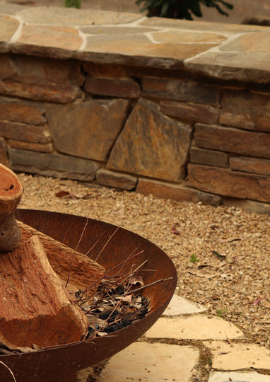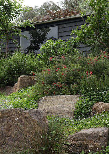 On a steep, south facing block there was a need to create terraces and landings for accessibility, functionality and communal gatherings. The snaking stone wall separates the upper and lower levels, with native shrubs and fruit trees growing up to provide easy pickings.