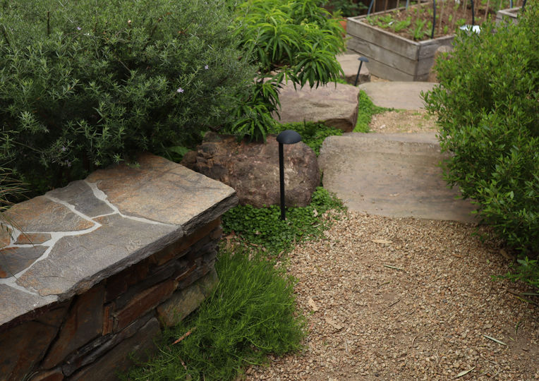 At the bottom of the front yard, a lawn area retained by large mudstone boulders, provides space to run and play for the kids (and two GSPs!), while native shrubs and ground-covers attract pollinators and other wildlife looking for a snack - while the pizza oven does the same for the guests at this garden built to entertain and unwind.