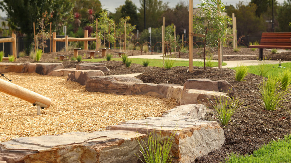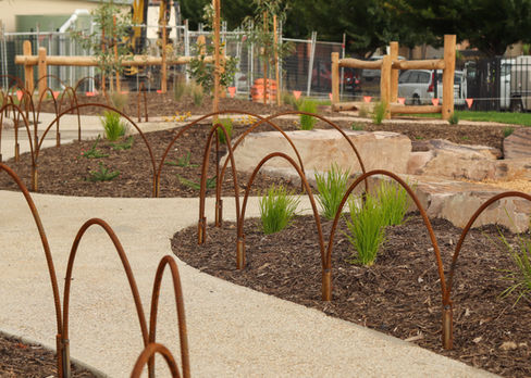 We designed and built this new natural-style playground area for a client we have been working with over several years now. This latest addition features an exposed aggregate concrete path that winds its way around multiple play areas containing timber play equipment. Steel Hoop Edging has been used to create a durable and aesthetic barrier to the garden beds, in which a variety of hardy native shrubs and groundcovers will grow to create a layered, immersive space for exploration and play. A timber bridge spans the dry creek bed adorned with mudstone rock and for those wanting to contemplate or chit-chat, there are park benches strategically placed to take in the future canopy of the trees.